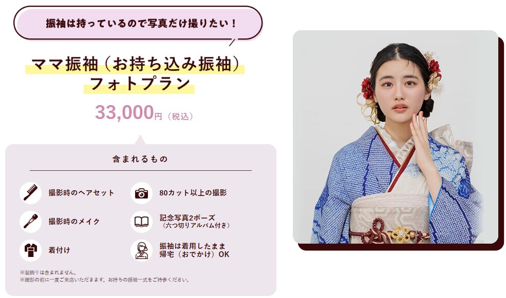 | ママ振袖(持ち込み振袖)フォトプラン | 約33,000円 | 持ち込み振袖点検、ヘアセット・メイク、着付け、80カット以上撮影、六つ切りアルバム2ポーズ付き |