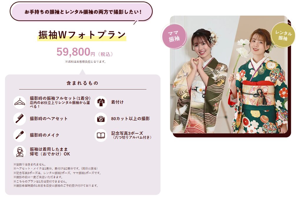 「レンタル振袖とママ振袖、両方で撮りたい!」という方には、振袖Wフォトプラン(59,800円・税込)もあります。1回の撮影で2着の振袖を着て、合計3ポーズの記念写真が残せるお得なプランです。